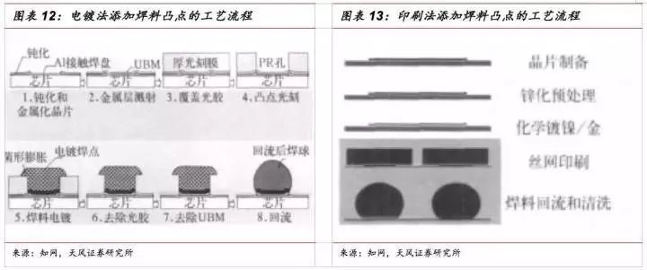 焊盘再分布完成之后,需要在芯片上的焊盘添加凸点,焊料凸点制作技术可采用电镀法、化学镀法、蒸发法、置球法和焊膏印刷法。目前仍以电镀法最为广泛,其次是焊膏印刷法。