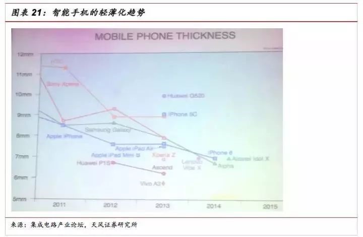 手机轻薄化带来SiP需求增长。手机是SiP封装最大的市场。随着智能手机越做越轻薄,对于SiP的需求自然水涨船高。从2011-2015,各个品牌的手机厚度都在不断缩减。轻薄化对组装部件的厚度自然有越来越高的要求。以iPhone 6s为例,已大幅缩减PCB的使用量,很多芯片元件都会做到SiP模块里,而到了iPhone8,有可能是苹果第一款全机采用SiP的手机。这意味着,iPhone8一方面可以做得更加轻薄,另一方面会有更多的空间容纳其他功能模块,比如说更强大的摄像头、扬声器,以及电池。