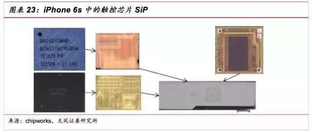 触控芯片。在Iphone6中,触控芯片有两颗,分别由Broadcom和TI提供,而在6S中,将这两颗封在了同一个package内,实现了SiP的封装。而未来会进一步将TDDI整个都封装在一起。iPhone6s中展示了新一代的3D Touch技术。触控感应检测可以穿透绝缘材料外壳,通过检测人体手指带来的电压变化,判断出人体手指的触摸动作,从而实现不同的功能。而触控芯片就是要采集接触点的电压值,将这些电极电压信号经过处理转换成坐标信号,并根据坐标信号控制手机做出相应功能的反应,从而实现其控制功能。3D Touch的出现,对触控模组的处理能力和性能提出了更高的要求,其复杂结构要求触控芯片采用SiP组装,触觉反馈功能加强其操作友好性。