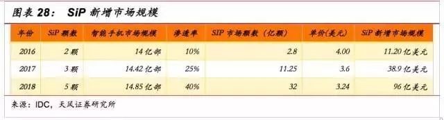 市场渗透率将迅速提升。我们预计,SiP在智能手机中的渗透率将从2016年的10%迅速提升到2018年的40%。在轻薄化趋势已经确定的情况下,能完美实现轻薄化要求的SiP理应会得到更多的应用。不止是苹果,我们预计国内智能手机厂商也会迅速跟进。此外,渗透率提升不单是采用SiP的智能手机会增多,在智能手机中使用的SiP的颗数也会增加。两个效应叠加驱使SiP的增量市场迅速扩大。